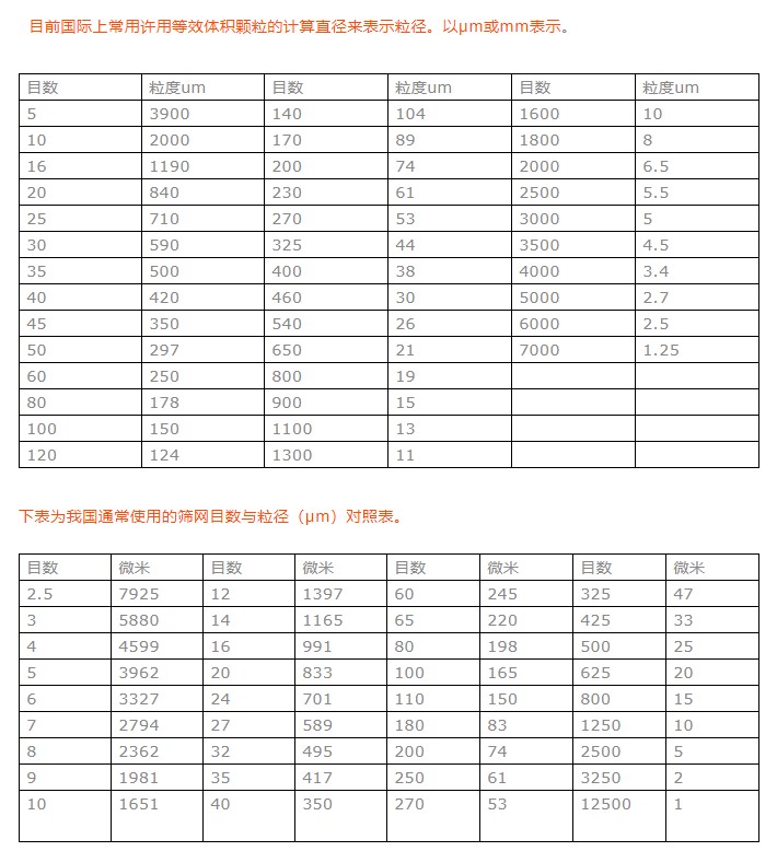 計量單位目粒度是指原料顆粒的尺寸,一般以顆粒的大長度來表示。網(wǎng)目是表示標準篩的篩孔尺寸的大小。在泰勒標準篩中,所謂網(wǎng)目就是2.54厘米(1英寸)長度中的篩孔數(shù)目,并簡稱為目。